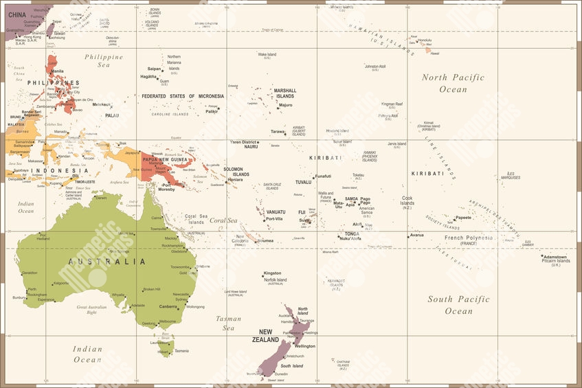Magnetische Landkarte Australien und Ozeanien, illustrierte, bunte