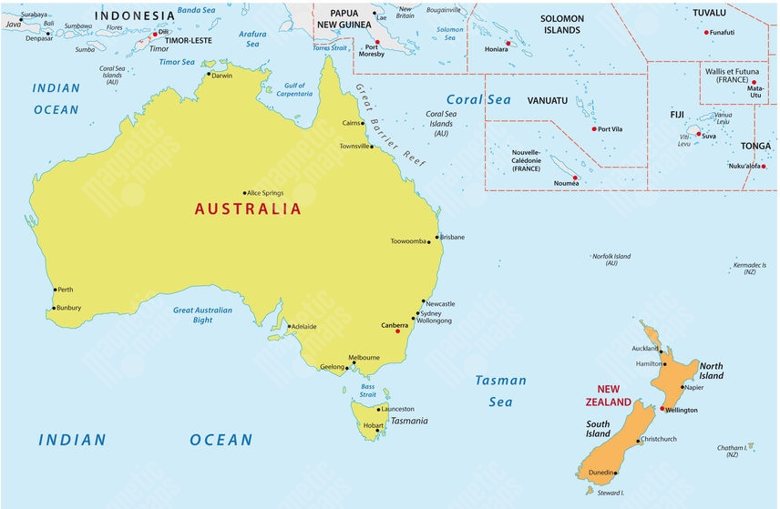 Magnetische Landkarte Australien und Ozeanien, politische, bunte