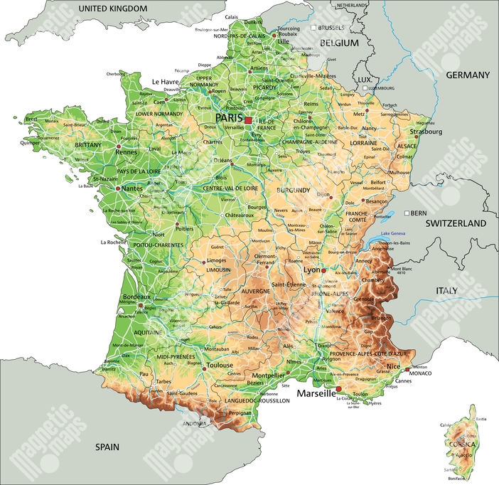 Magnetische Landkarte Frankreich, geografische, bunte