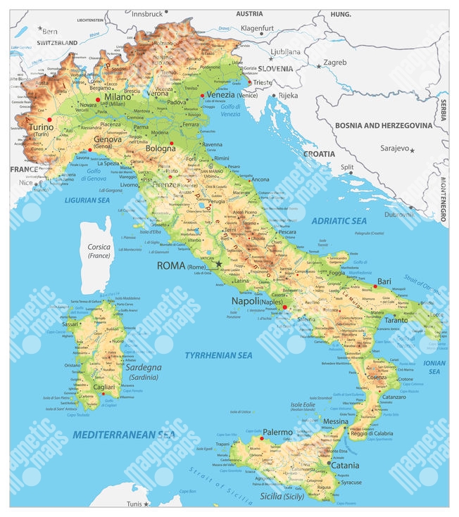 Magnetische Landkarte Italien, geografische, mit Beschriftungen