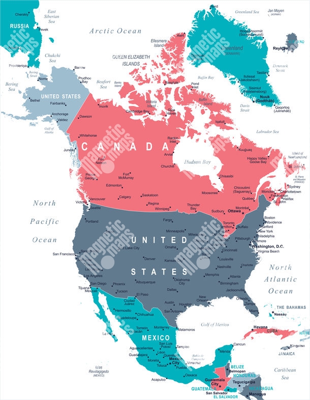 Magnetische Landkarte Nordamerika, illustrierte, bunte