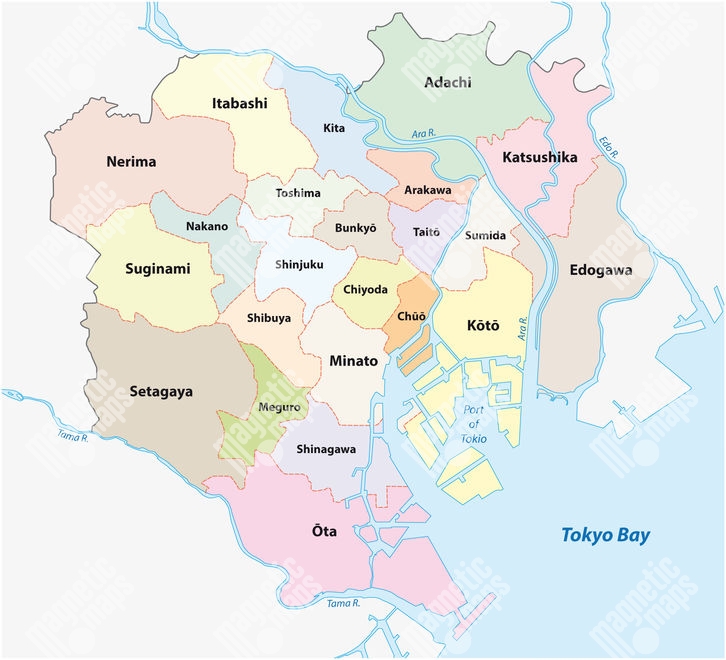 Magnetische Landkarte Tokyo, administrative, bunte